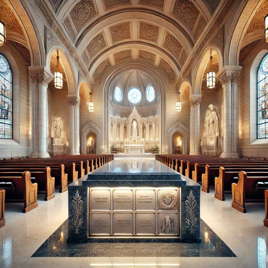 Columbarios modernos de mármol blanco en las paredes de una iglesia, vistos desde el lado opuesto, con un diseño minimalista y elegante en un ambiente solemne y armonioso.